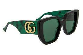 Pared-back simplicity characterises the essential shapes, lines and colours of this concept, for a cool and on-trend mood. Inspired by a gender fluid look, translated in a street style effortless look. Oversize gemetric shape in plastic chacacterized by bold volumes and strong personality. Gucci running logo embellishes the bold temples. The style is available with black front and contrasting ivory and green mother of pearl colored temples. Colorful lenses give the style a feminine touch. MANUFACTURER Gucci GENDER Womens FRAME SHAPE Butterfly, Squared FRAME MATERIAL Plastic FRAME COLOR Black, Green LENS COLOR Green RAME SIZE LENS 54 FRAME SIZE BRIDGE 19 FRAME SIZE ARM 145